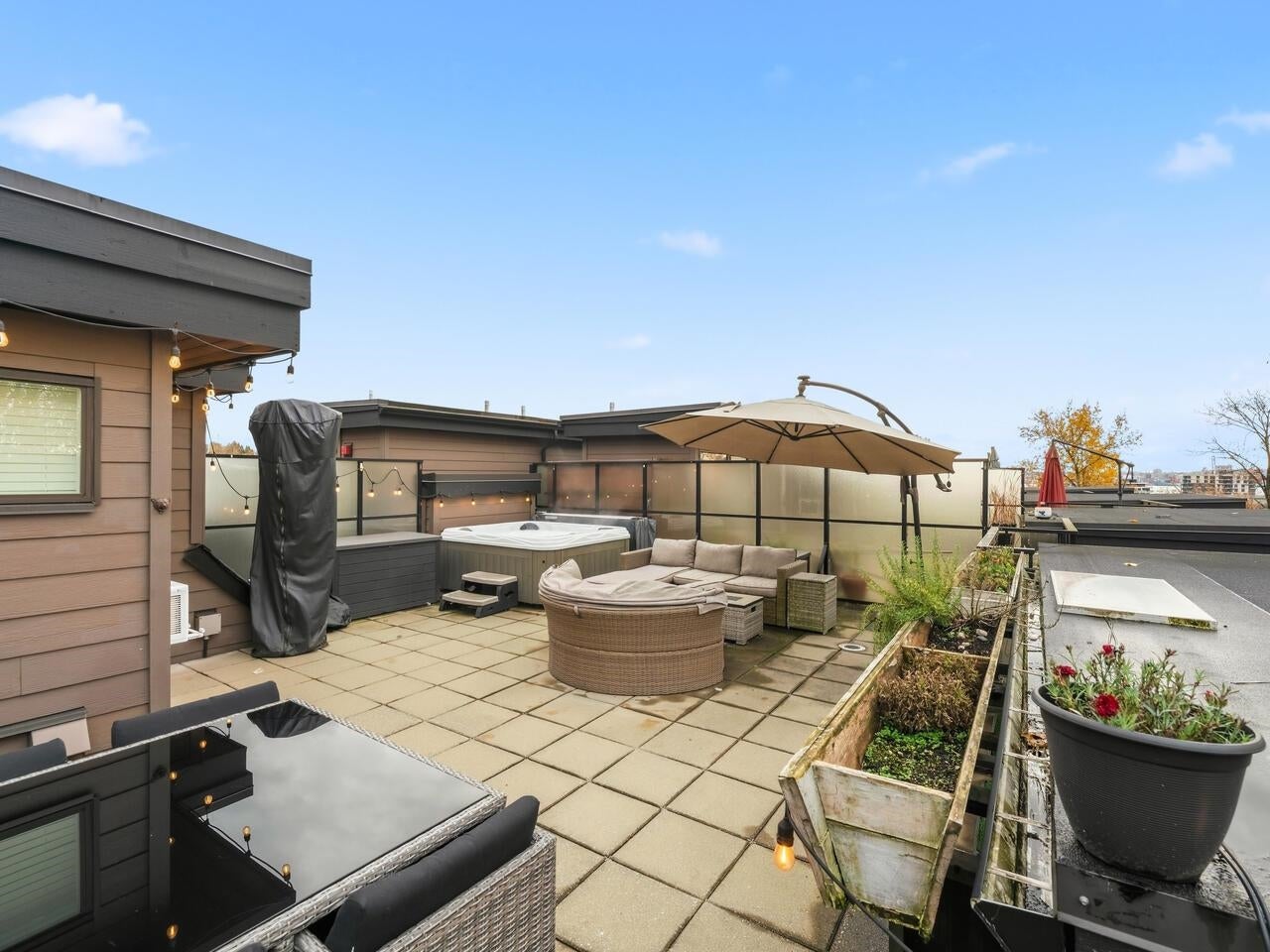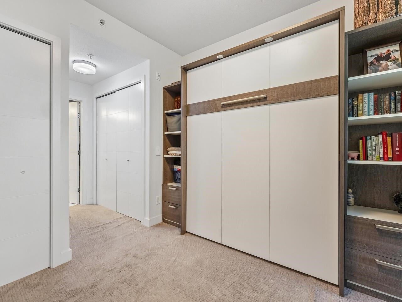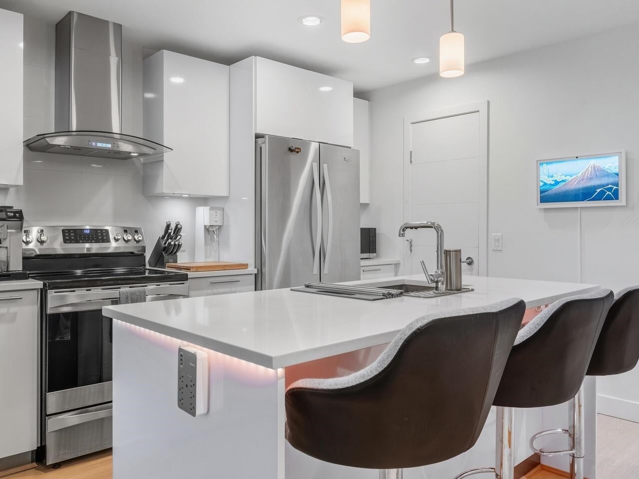 Penthouse living at The Shore by Adera. This bright 2 bed + den home offers 920 sq.ft. of interior space plus a rare 525 sq.ft. private rooftop patio with hot tub and peekaboo downtown views—ideal for entertaining or relaxing outdoors. The contemporary kitchen features a centre island, stainless steel appliances, and a large, customized pantry. The den works perfectly as a home office, while the second bedroom includes a sleek Murphy bed for added flexibility. Enjoy A/C, smart-home capability, and two parking stalls (rare for the building). Located steps to shops, dining, schools, and trails, with amenities including a gym, club room, recreation space, and storage locker. School catchments: Westview Elementary & Carson Graham Secondary.
