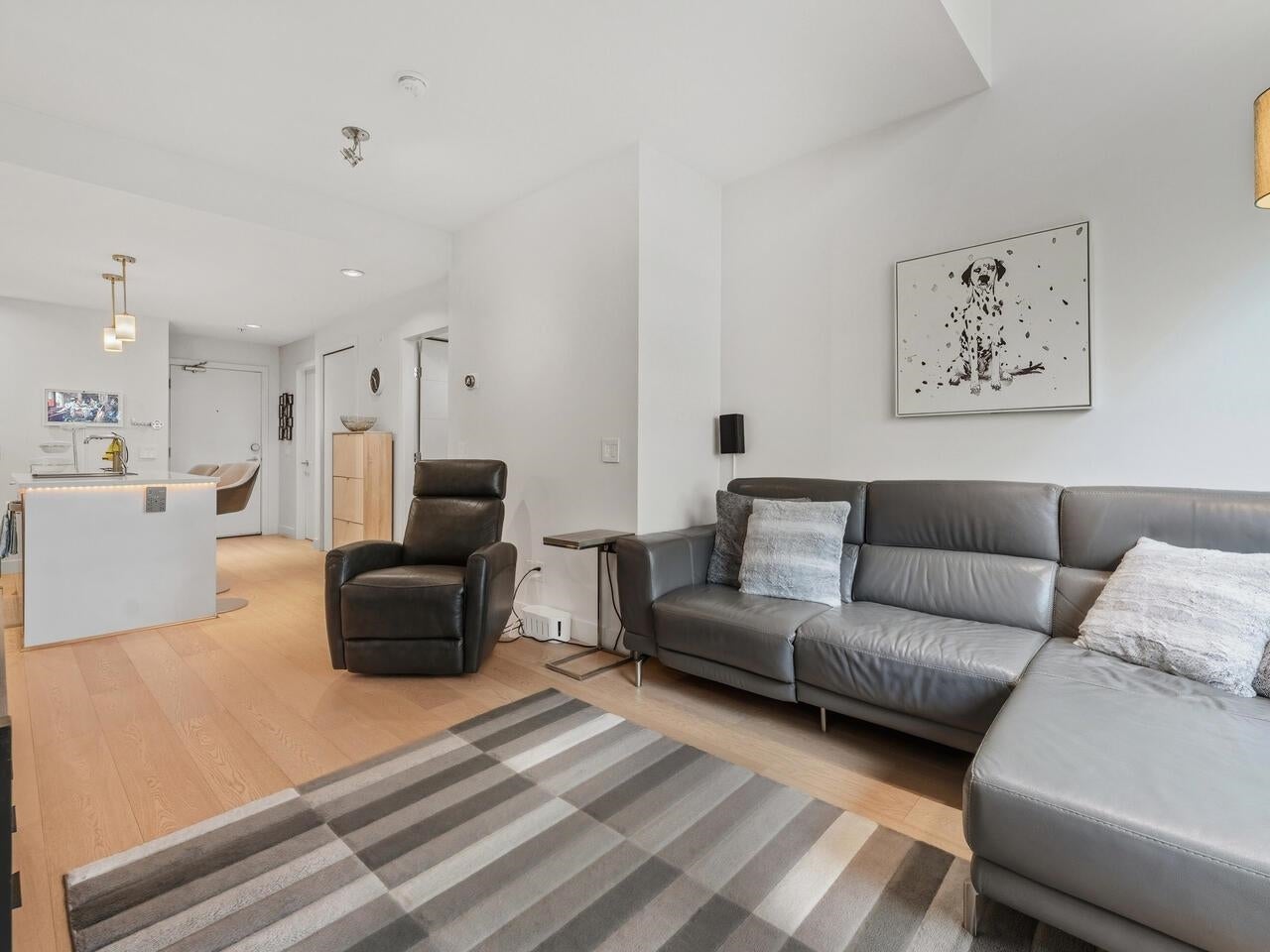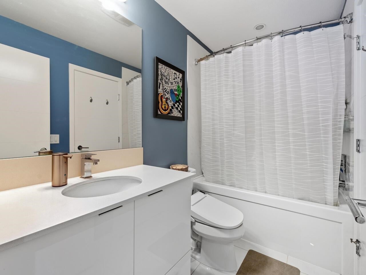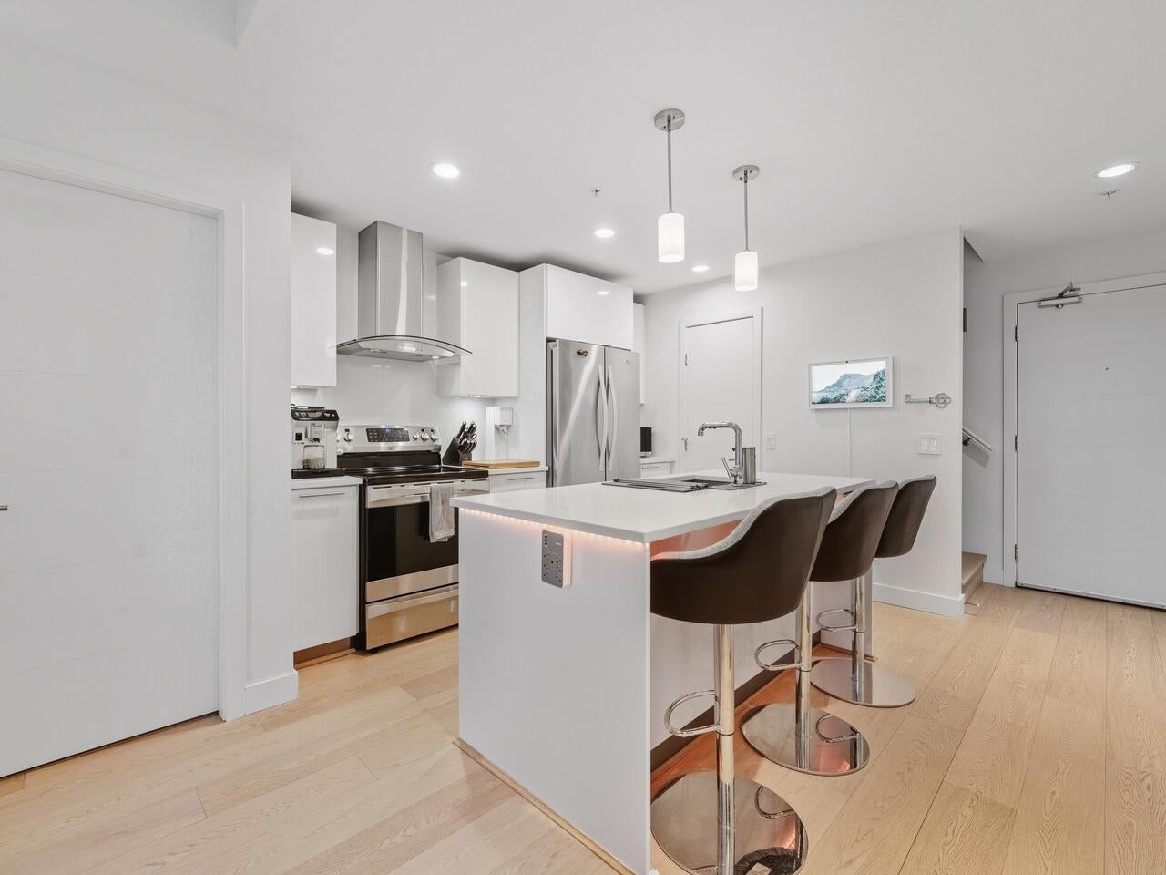 Penthouse living at The Shore by Adera. This bright 2 bed + den home offers 920 sq.ft. of interior space plus a rare 525 sq.ft. private rooftop patio with hot tub and peekaboo downtown views—ideal for entertaining or relaxing outdoors. The contemporary kitchen features a centre island, stainless steel appliances, and a large, customized pantry. The den works perfectly as a home office, while the second bedroom includes a sleek Murphy bed for added flexibility. Enjoy A/C, smart-home capability, and two parking stalls (rare for the building). Located steps to shops, dining, schools, and trails, with amenities including a gym, club room, recreation space, and storage locker. School catchments: Westview Elementary & Carson Graham Secondary.